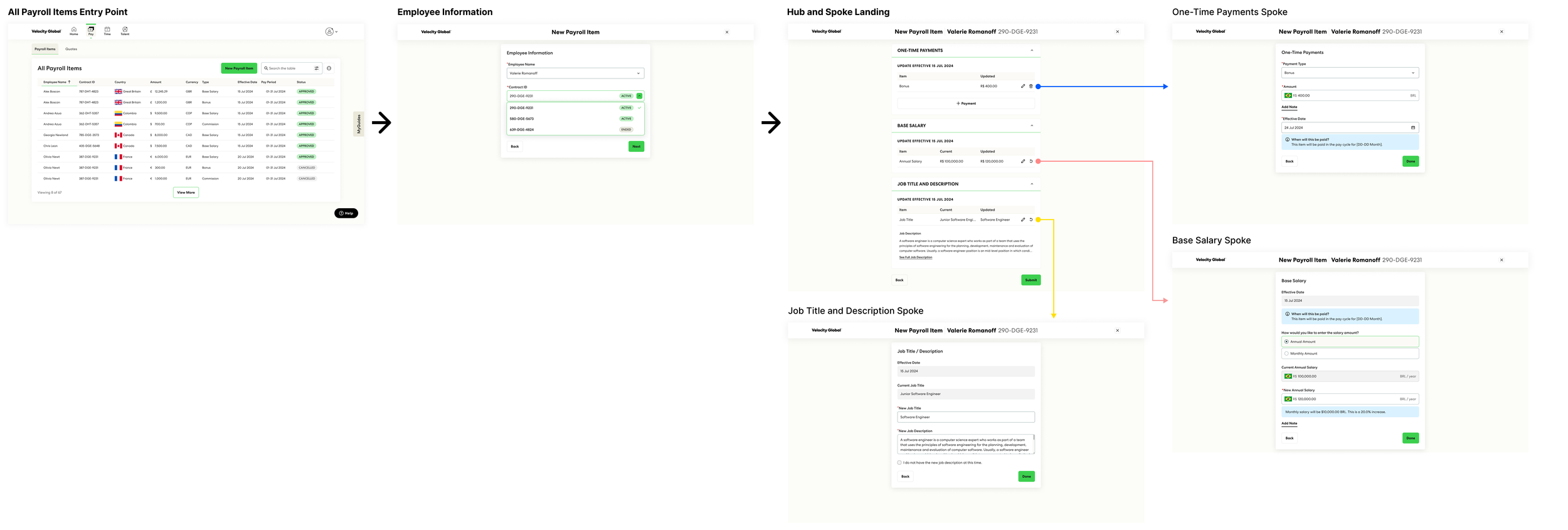 With a clear understanding of the problem space and design principles, I explored multiple approaches to structuring the payroll change workflow. I developed two distinct design concepts—a sequential step-by-step flow and a hub-and-spoke model—each offering different advantages in terms of usability, flexibility, and efficiency.