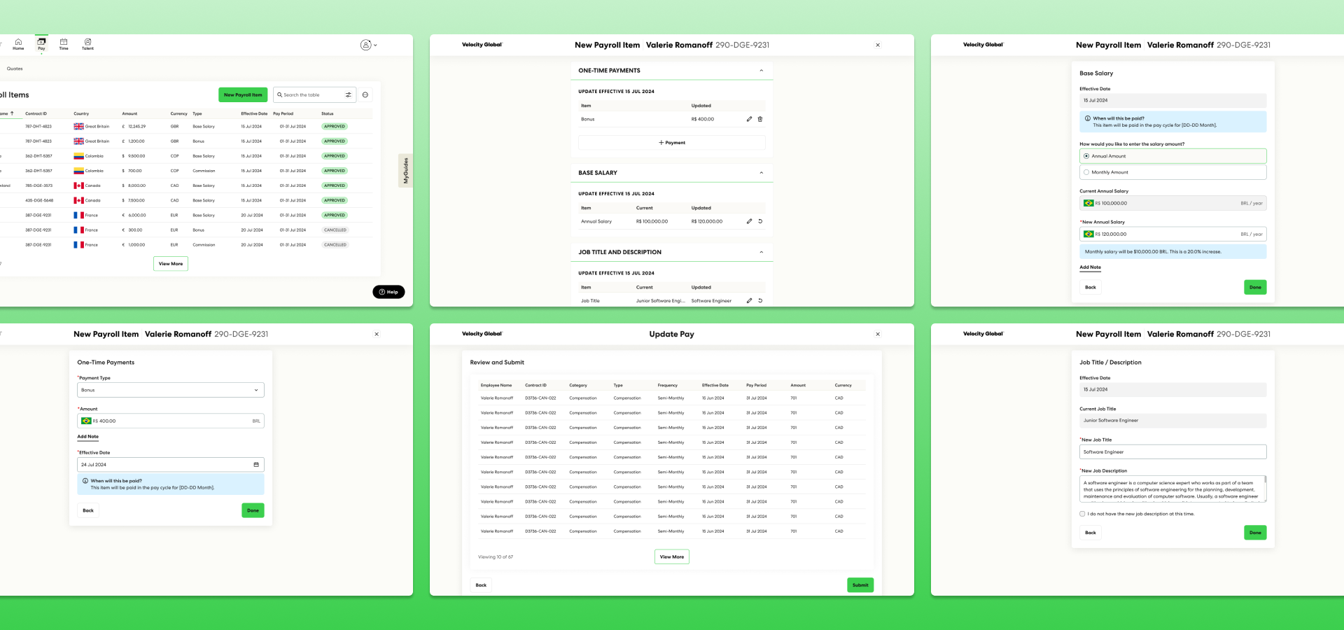 Customer self-serve submission of all combos of payroll item requests (base salary, job title and description, one-time payments, and allowances).