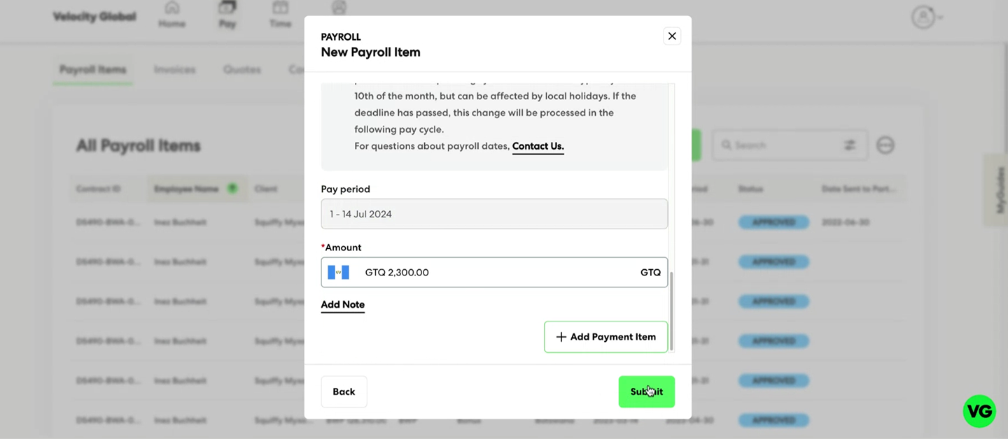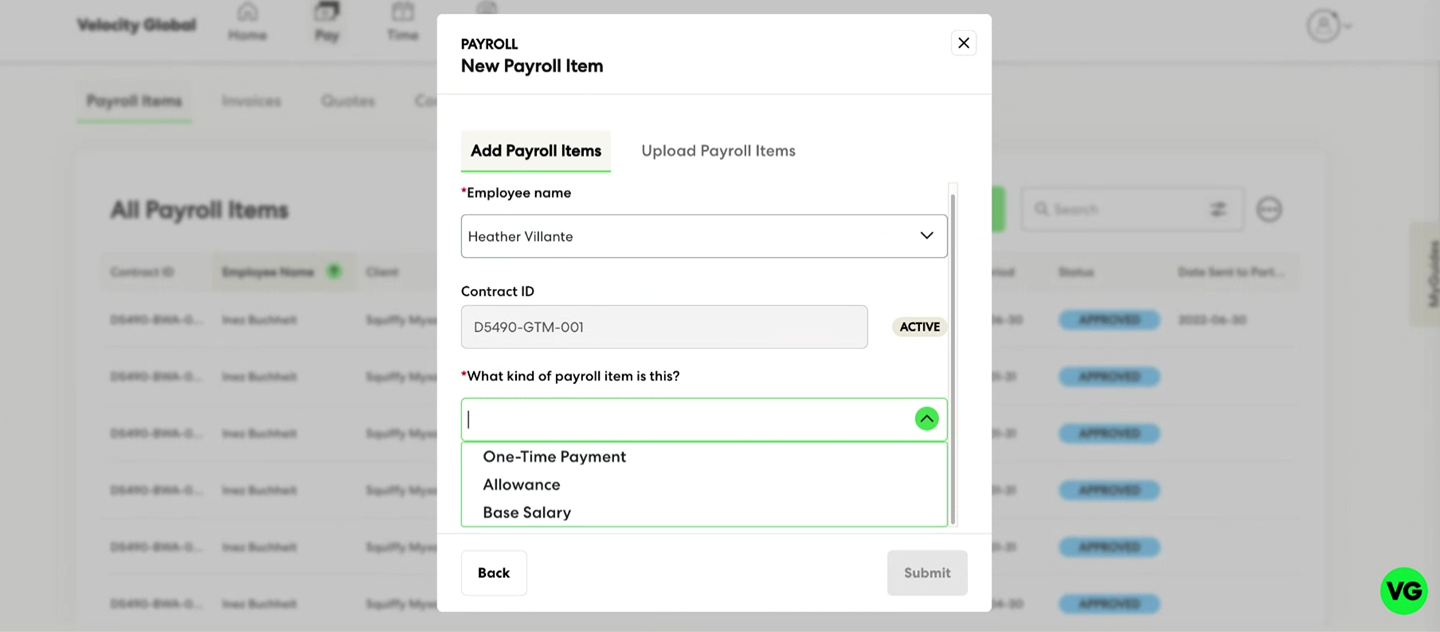 Submit payroll requests in the payroll item modal flow (Base Salary, One-Time Payments, and Allowances).