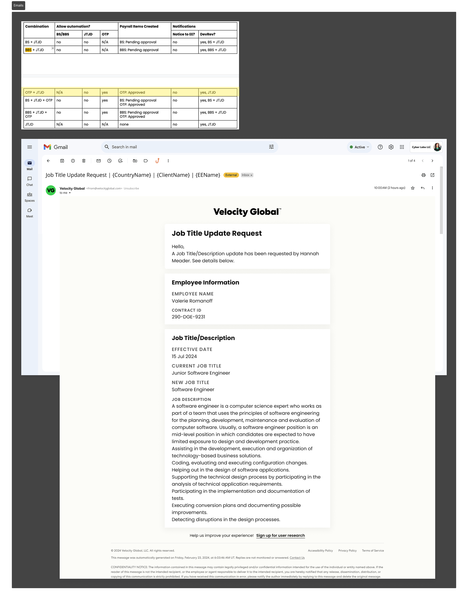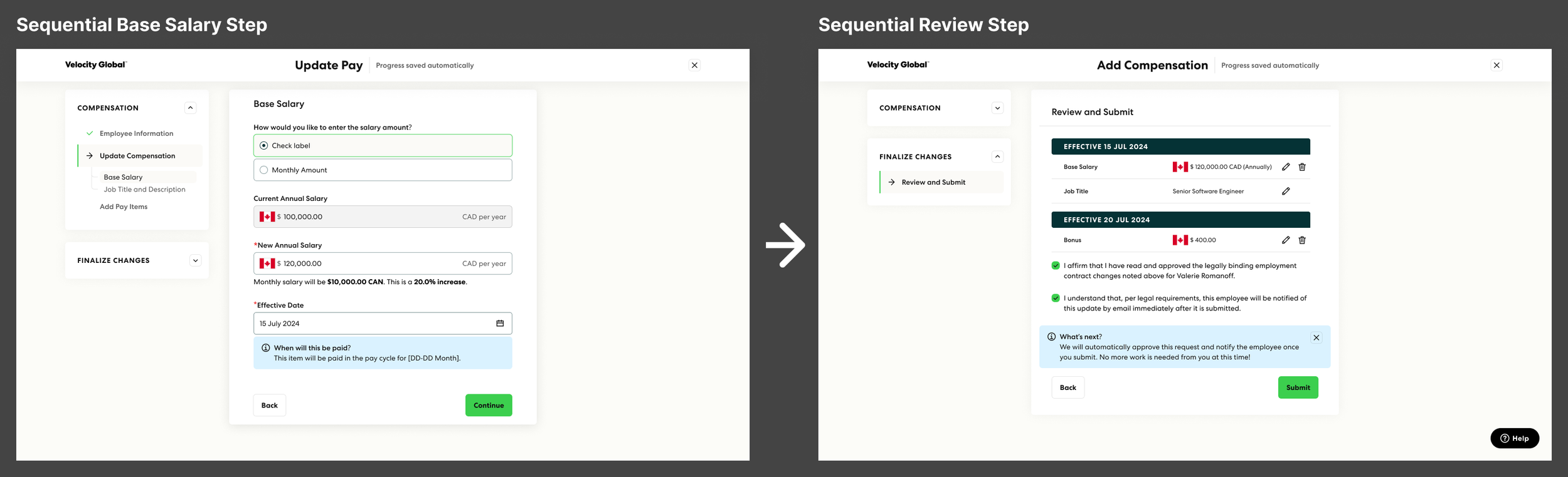 To align with Velocity Global’s goal of 100% customer self-serve, I was tasked with redesigning the payroll change request workflow to enable customers to submit all compensation-related updates including job title and description changes within a single request.